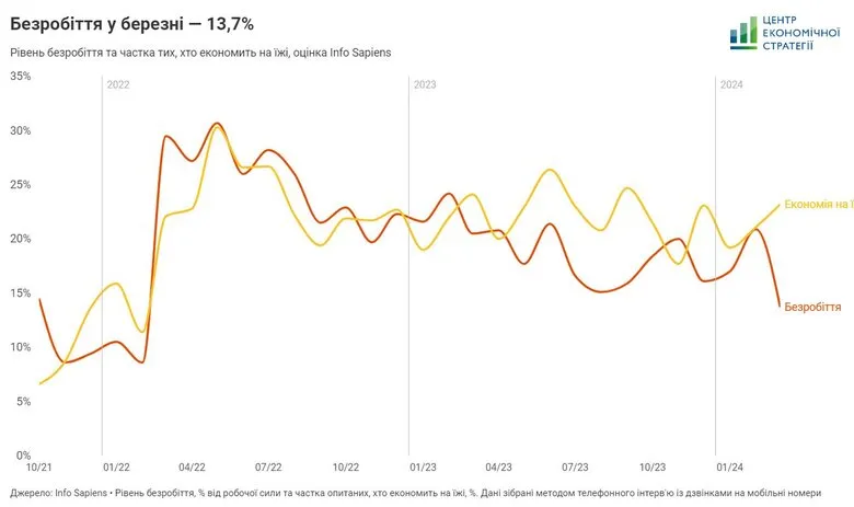 Також звертають увагу на проксі-показник рівня бідності – людей, які змушені економити на їжі. У березні 2024 року їх частка склала 23,2% від кількості опитаних.