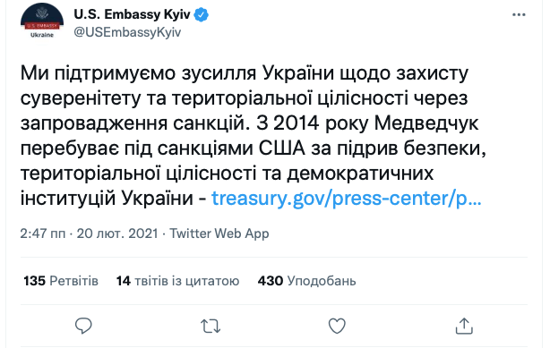 Посольство США нагадало, що українські санкції проти Медведчука є доброю, хоч і дуже довгоочікуваною справою / Скриншот