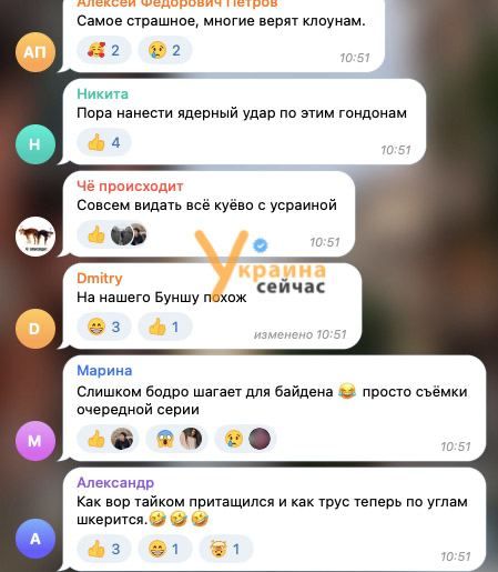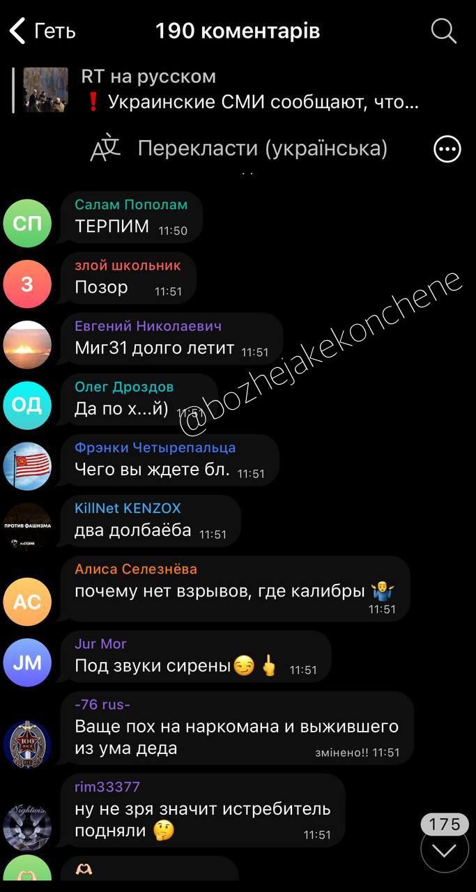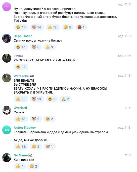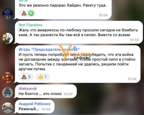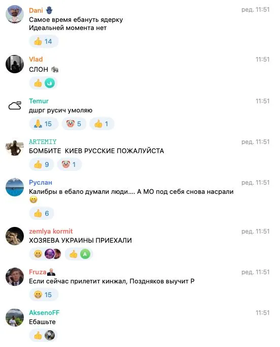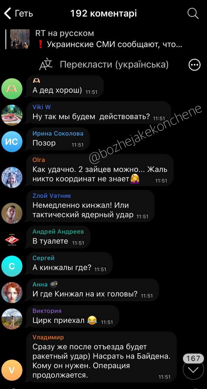 "Бомбіть Київ, росіяни, будь ласка", "Слон" (очевидно, про Байдена), "Ідеальнішого моменту для ядерки немає", – цинічно пишуть росіяни сьогодні.