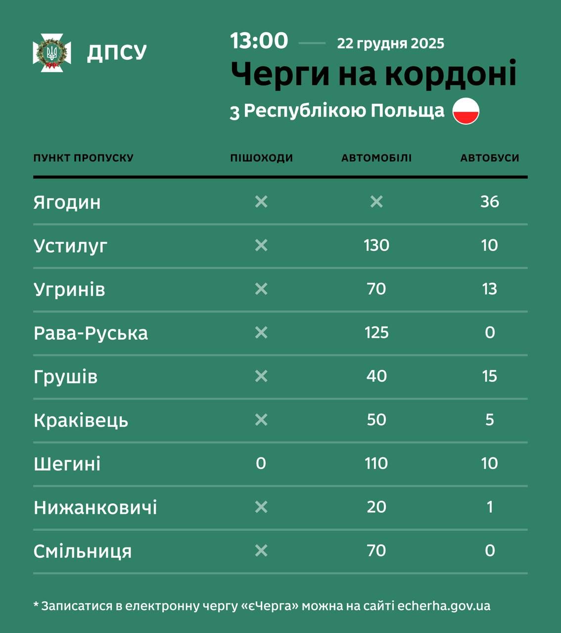 - На кордоні з Польщею спостерігаються значні черги, зокрема, у "Шегинях" 110 авто та 10 автобусів, у "Краківці" – 50 авто та 5 автобусів.