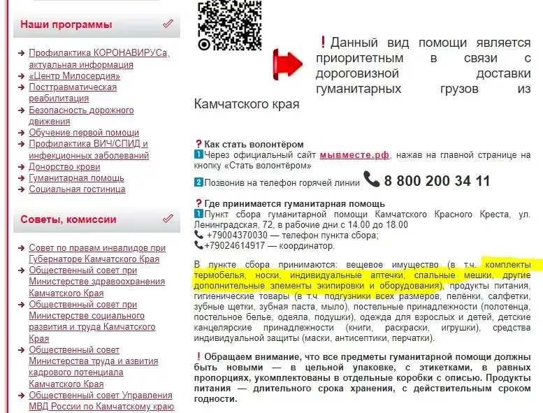 Яскравий приклад – Камчатське відділення Червоного Хреста. Хоч ЧХ і відхрещується від збору необхідних для військових речей, на сайті цього регіону чітко вказано, що збирають допомогу для "постраждалих від кризи в Україні, військовослужбовців і членів їхніх родин". Серед необхідного: термобілизна, шкарпетки, індивідуальні аптечки, спальні мішки й інші додаткові елементи спорядження.
