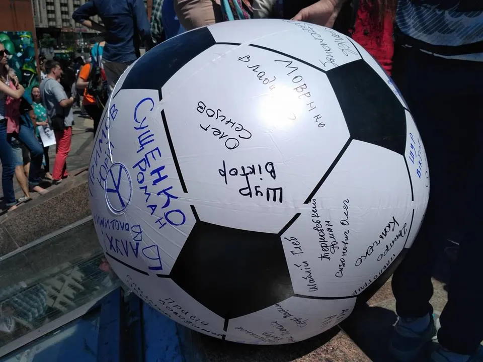 Вкінці акції українці показали "червону картку Кремлю". Вони написали на символічній червоній картці, за що російський режим на неї заслуговує. А на великому футбольному м’ячі – прізвища всіх наших політв'язнів, які в російських тюрмах. Кількаметрове полотно та м'яч відвезуть під посольство Росії й залишать там.