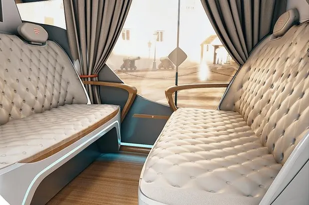 Та куди цікавіше зазирнути до середини цієї новинки. Салон – один в один відтворює традиційні кінні екіпажі. Сидіння розташовані одне навпроти одного, а місце водія відділене перегородкою. В автомобілі можуть комфортно розміститися шість пасажирів.