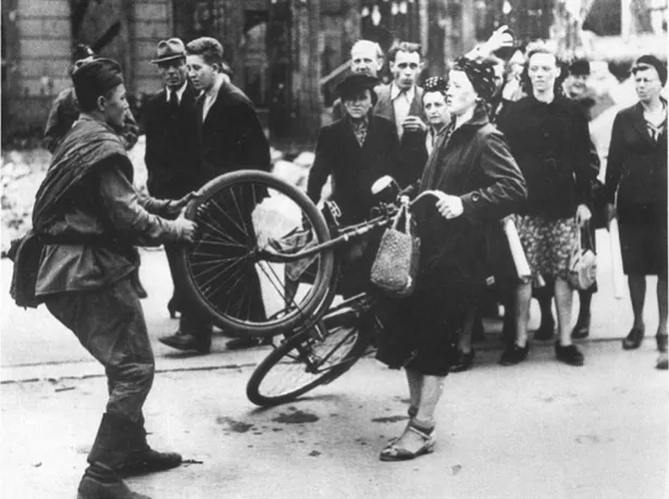 Російські мистецтвознавці довели, що і одяг солдата не радянський, і фото постановче, і взагалі російський солдат спасав німецьку жінку від оскаженілого "лісапєда" (сарказм).