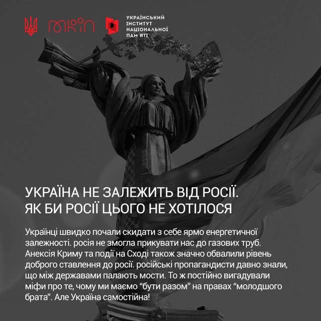 "Міфи про "братні народи" чи "єдиний народ" – абсолютно штучні. Концепція "братніх народів" – це хворий витвір радянської пропаганди на заміну російській імперській концепції "триєдиного народу". Це спроба насильно прив'язати українську історію до російської та заперечити право українців і білорусів на власний історичний вибір. Після Євромайдану це абсолютно втратило сенс. Нині, щоб обґрунтувати та виправдати агресію проти українського народу, кремлівська пропаганда почала говорити про "єдиний народ". Вони вплітають сюди і захист православ'я. Адже Росія визнає лише Московський патріархат. Та ми не єдиний народ і ніколи ним не були", – відзначили в Українському інституті національної пам'яті.