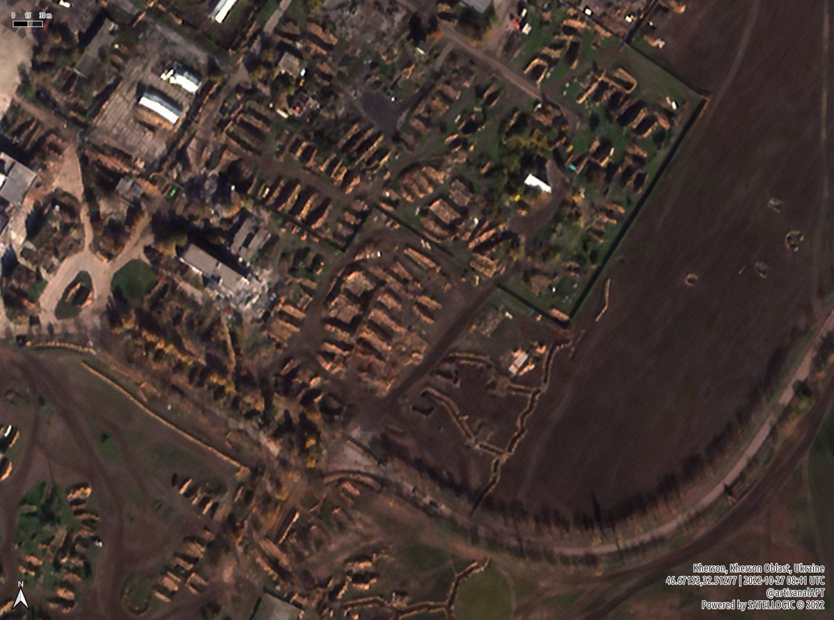 Зображення від 27 жовтня показують, що росіяни вивезли з Чорнобаївки майже всі транспортні засоби, залишивши після себе лиш сліди на землі.