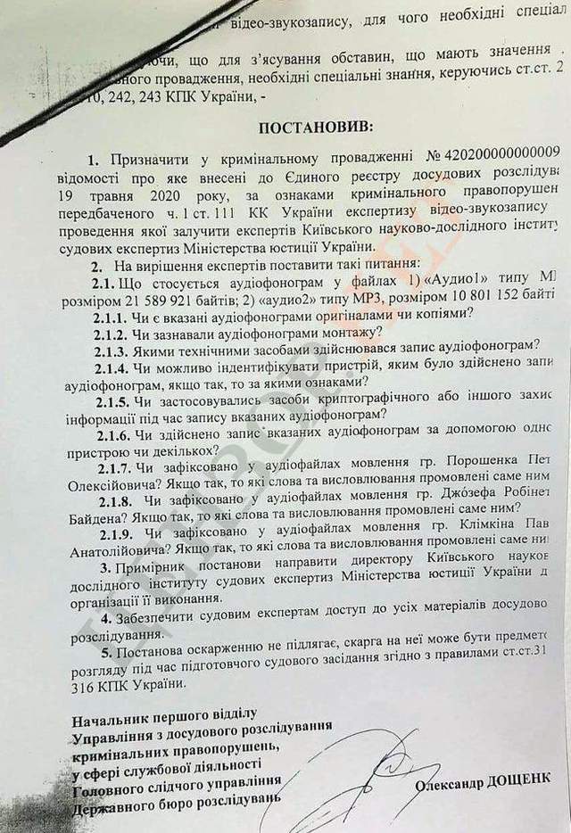 На фото – постанови про призначення експертизи відеозвукозапису від 10 липня 2020 та 10 лютого 2021 року. Тобто ДБР звернулось до Київського науково-дослідного інституту судових експертиз через 20 днів після інавгурації Джо Байдена.