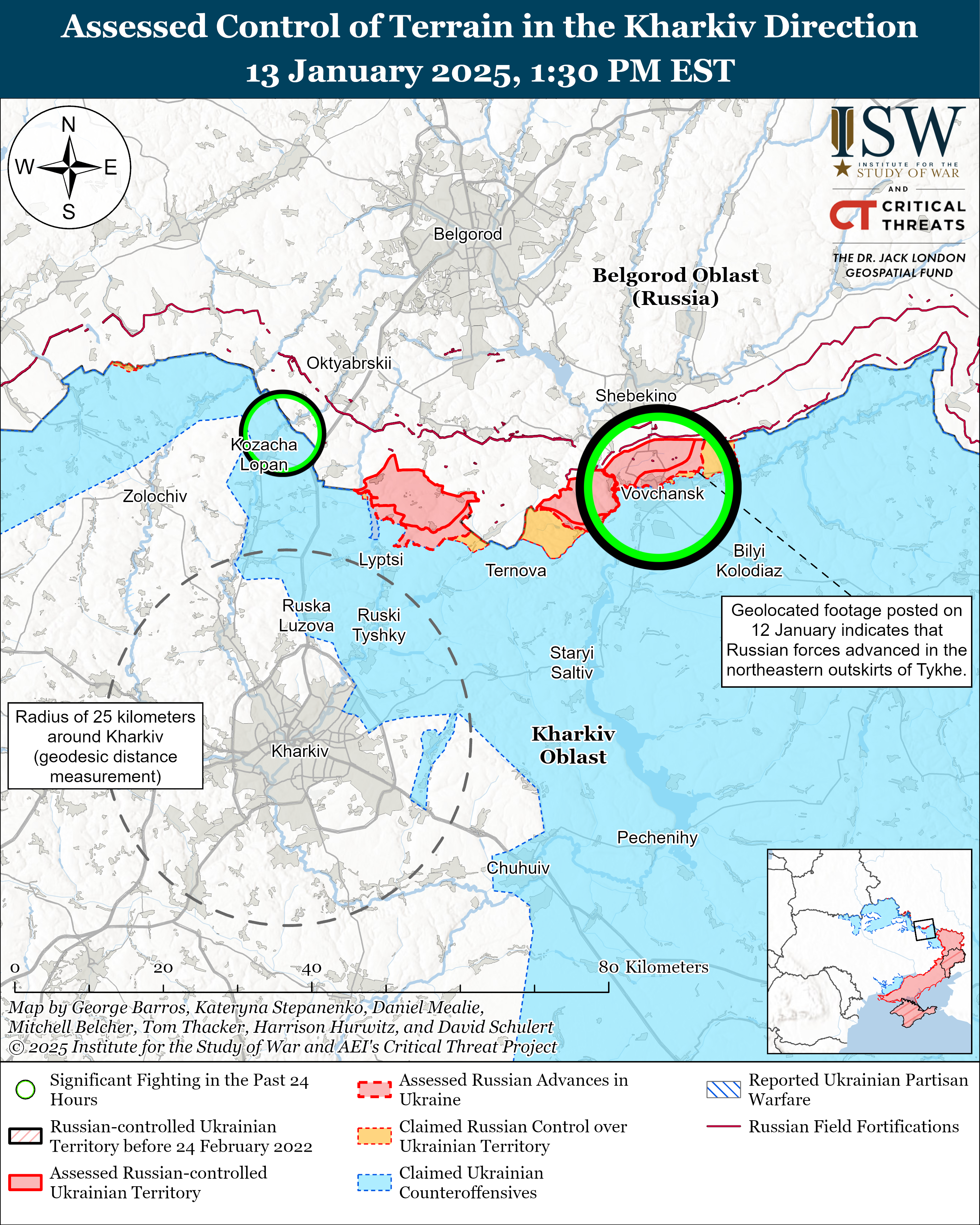 В Інституті зазначили, що російські війська продовжували наступальні операції на Куп'янському напрямку, однак жодних просувань не досягли. Крім того, окупанти намагаються використати несприятливі погодні умови для перетину річки Оскіл на невеликих човнах і плотах, накопичують сили у напрямку Дворічної та Масютівки (на південь від Дворічної).