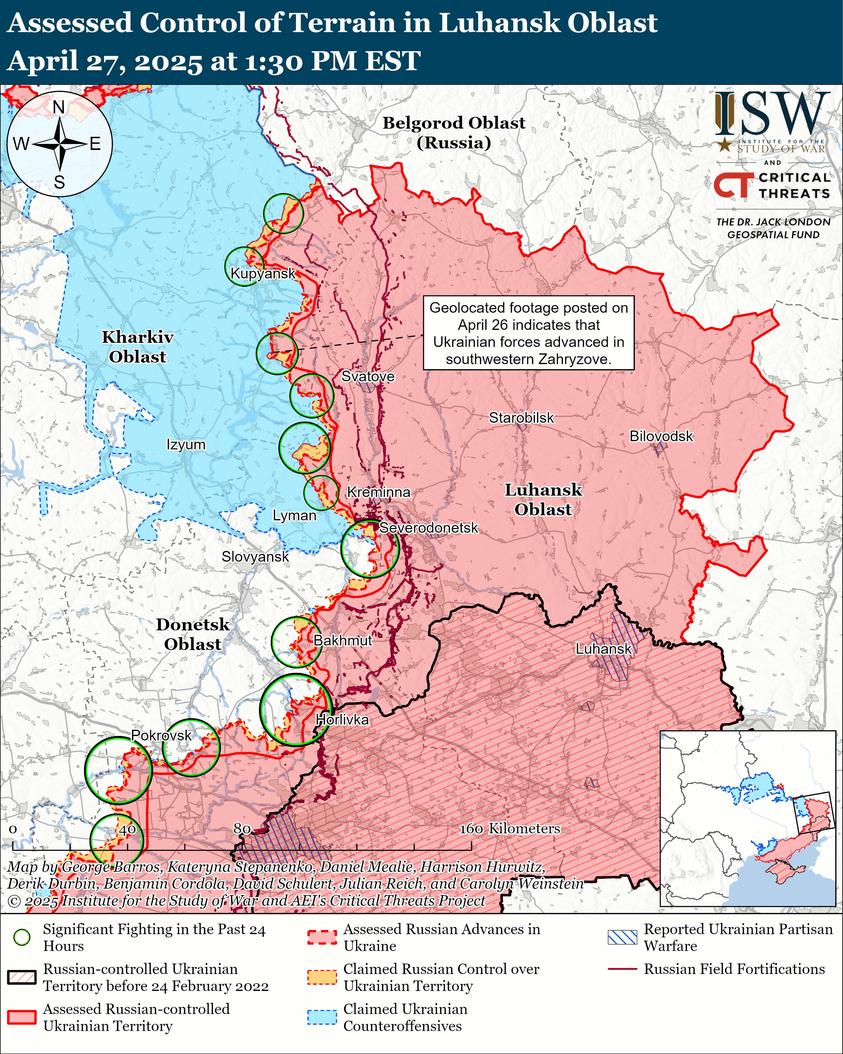 За даними аналітиків, 27 квітня росіяни не мали жодних підтверджених просувань ані на Курщині, ані на Бєлгородщині. В обох регіонах Росії, за словами президента Зеленського, тривають операції Збройних Сил України.