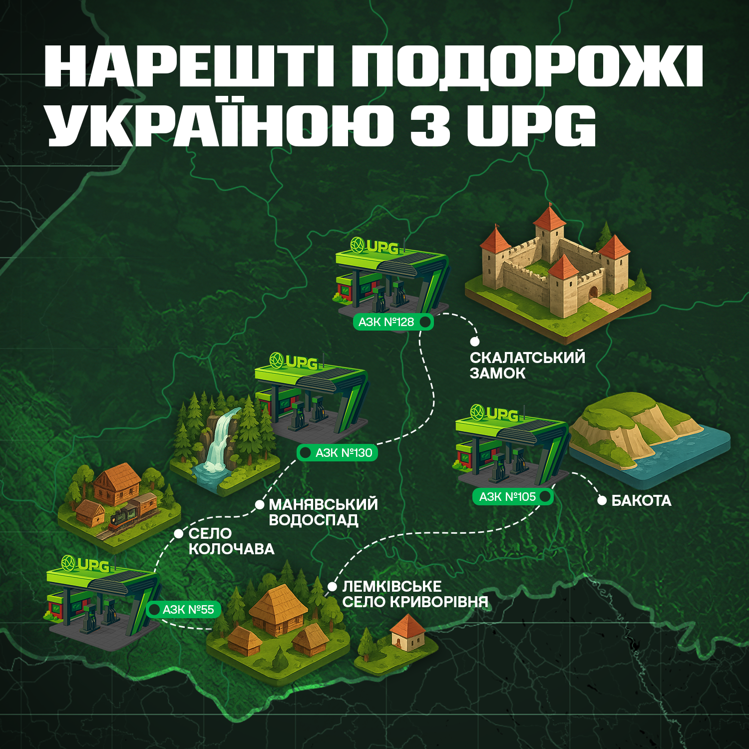 Тривалі автоподорожі – це виклик, який потребує зручних і приємних зупинок. Перед поїздкою визначте точки зупинки, які дозволять відпочити, перекусити та заправити авто. Дбайливим супутником у вашій пригоді стане мережа АЗК UPG, яка славиться ароматною кавою, стравами від шеф-кухарів та якісним пальним. Піклуйтеся про себе, як про свою машину. Сьогодні на комплексах UPG мандрівники можуть закрити всі потреби за одну зупинку. Це місце, де кожен може піклуватися в дорозі не тільки про машину, а й про всіх, хто в ній. На шляху до запропонованих локацій рекомендуємо зупинитися на заправно-відпочинкових комплексах за такими адресами: