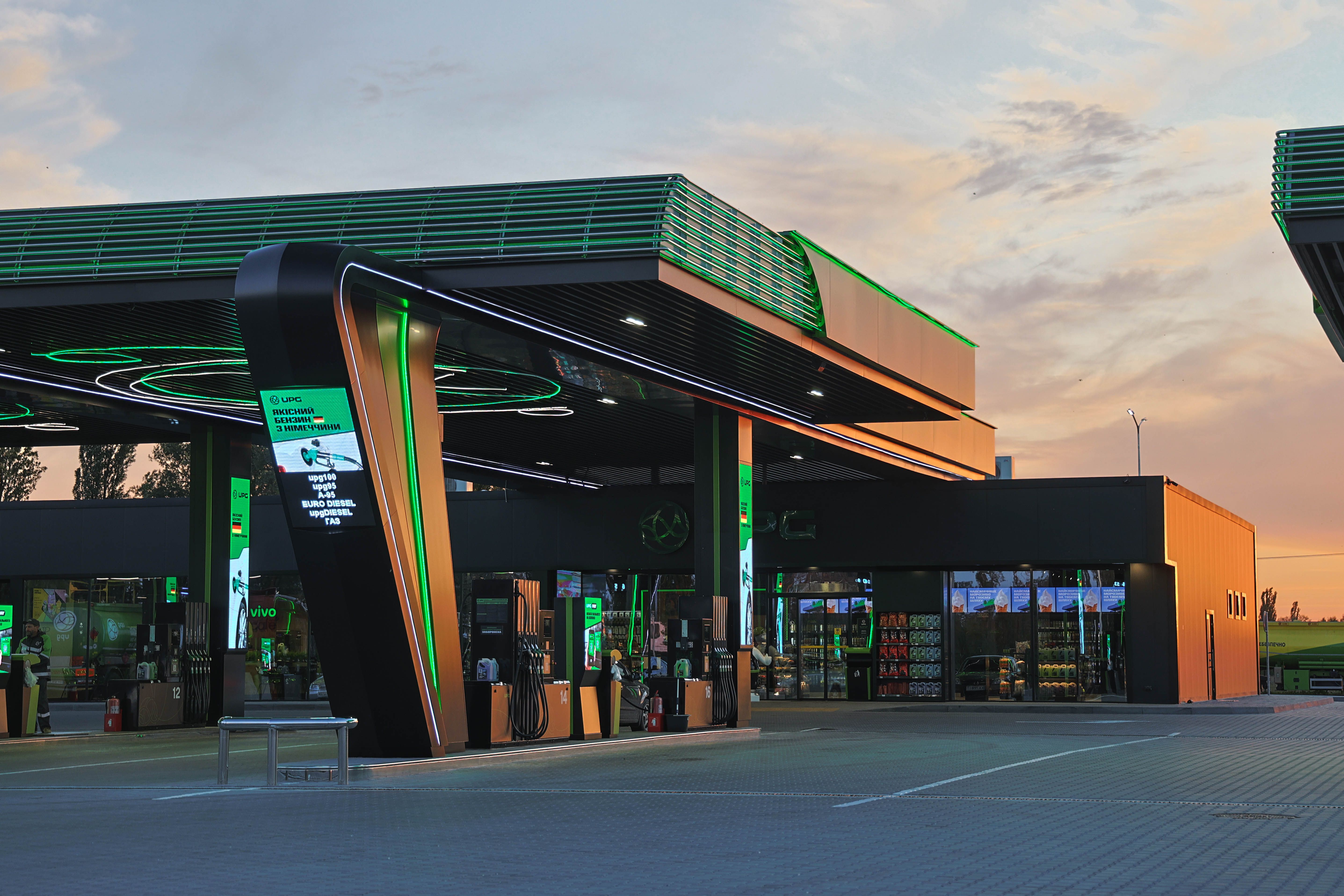 Кожен комплекс UPG – це просторий паркінг, великі заправки, а також ресторани з кухнею від шефа та повноцінним асортиментом у меню, що оновлюється кожного сезону. На наших АЗК можна насолодитися Мммкавою – 100% арабіка, без кофеїну, на традиційному, безлактозному чи мигдалевому молоці, приготована на професійному обладнанні.