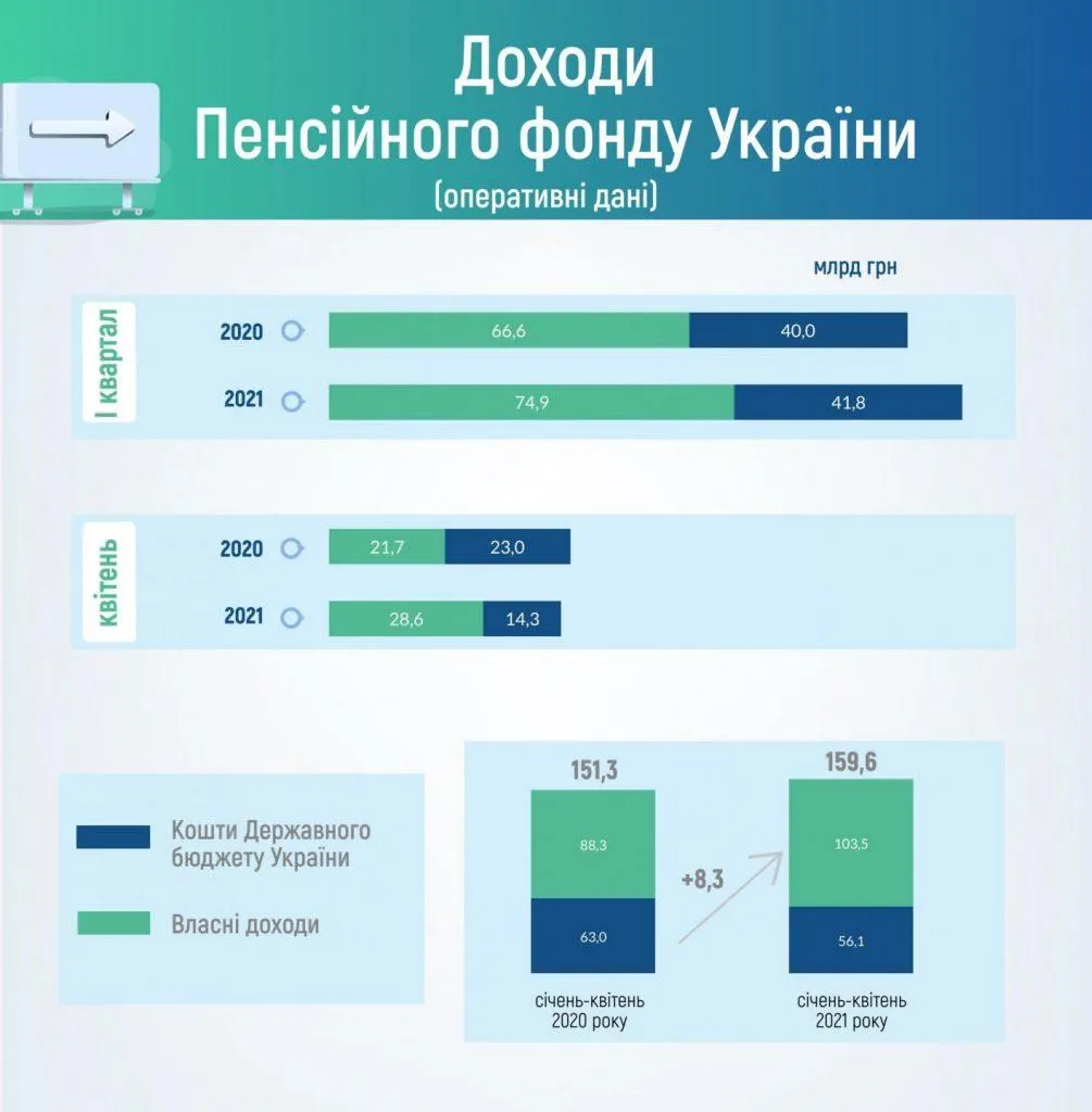 Загалом, доходи ПФУ за січень – квітень 2021 року складають 159,6 мільярда гривень. Тоді як витрати – 167,2 мільярда гривень.
