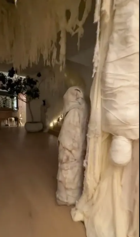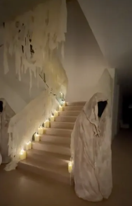44-річна Кім Кардаш'ян показала свій "будинок із привидами" 2 жовтня, пише India Times. Коридор дому нагадував темну печеру, заповнену павутиною, білими полотнами й навіть мумією, що звисає догори ногами у павутині. Додатково Кім розставила навколо сходів примар у капюшонах і мерехтливі свічки, щоб завершити зловісну атмосферу. Діти Кім – Норт, Сейнт, Чикаго та Псалм – були не менш у захваті. Вона розповіла, що її сестра Кортні подарувала їм імбирний будиночок у геловінському стилі, прикрашений привидами, відьмами, солодкими деревами та їхніми іменами, написаними на маленьких білих ярликах.