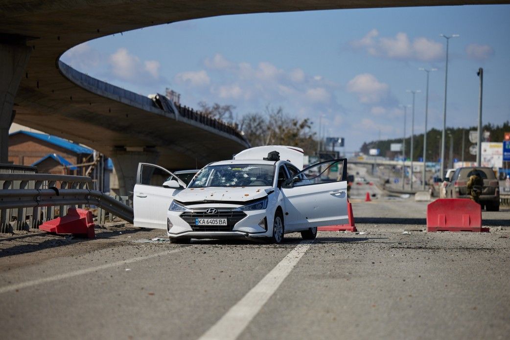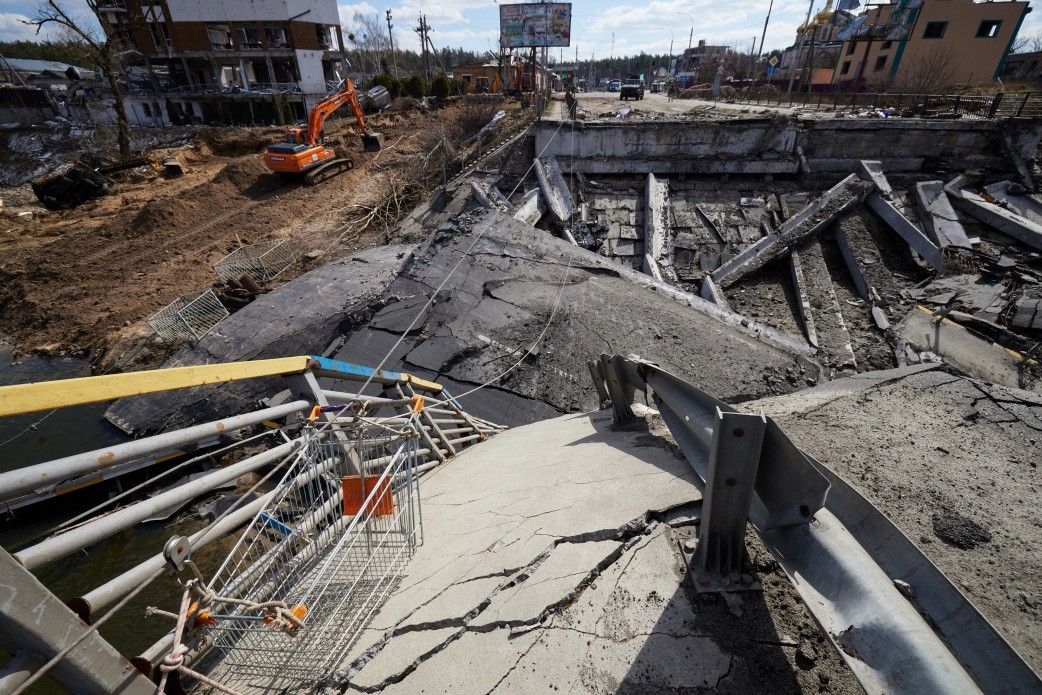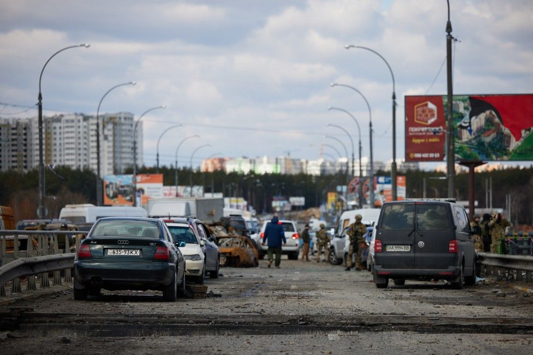 Під час свого візиту президент оглянув дорогу зі знищеною російською технікою, знищений міст, а також поспілкувався з журналістами. Зеленський звинуватив Росію у воєнних злочинах та геноциді.