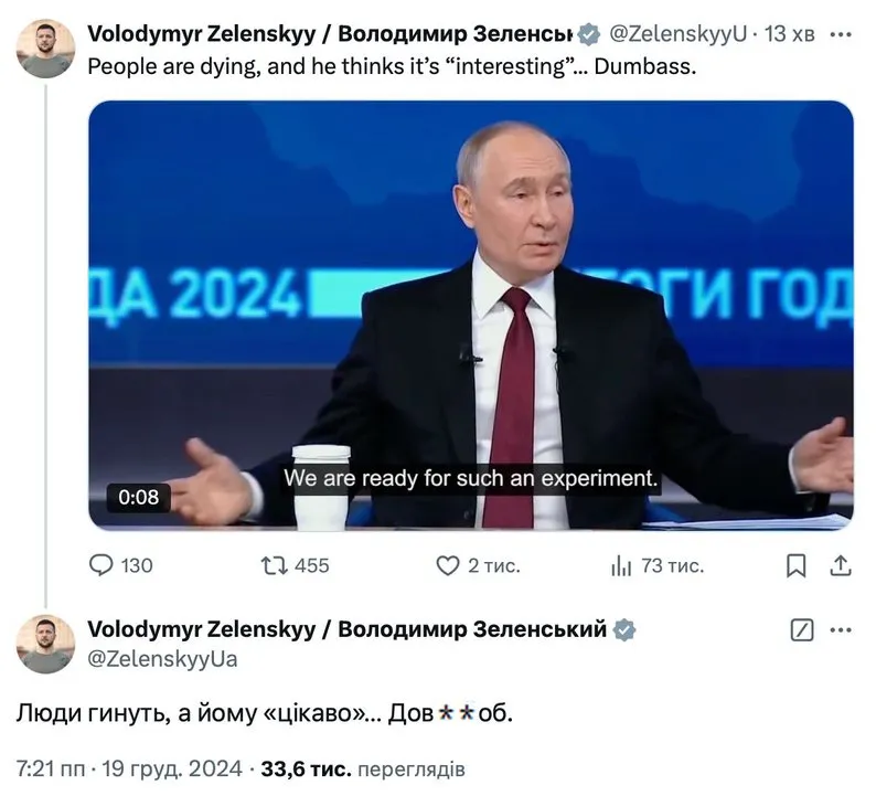 Різкі висловлювання, які не притаманні дипломатії, Зеленський продовжив використовувати й щодо Путіна. Путін запропонував влаштувати "високотехнологічну дуель зі США" під час ракетних ударів по Києву. Відповідь Зеленського не потребує зайвих коментарів: "Люди гинуть, а йому "цікаво"… Дов**йоб", – заявив президент.
