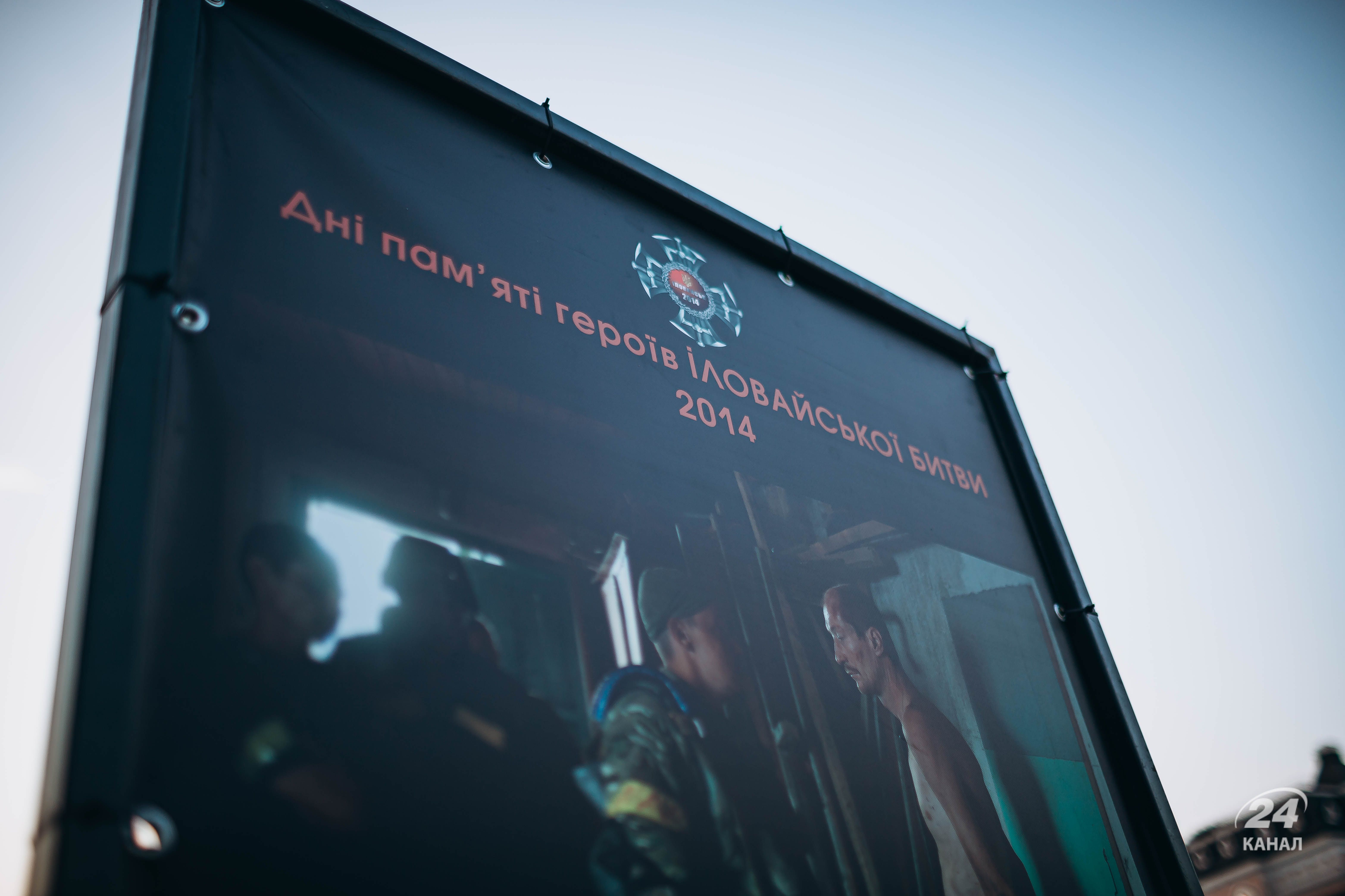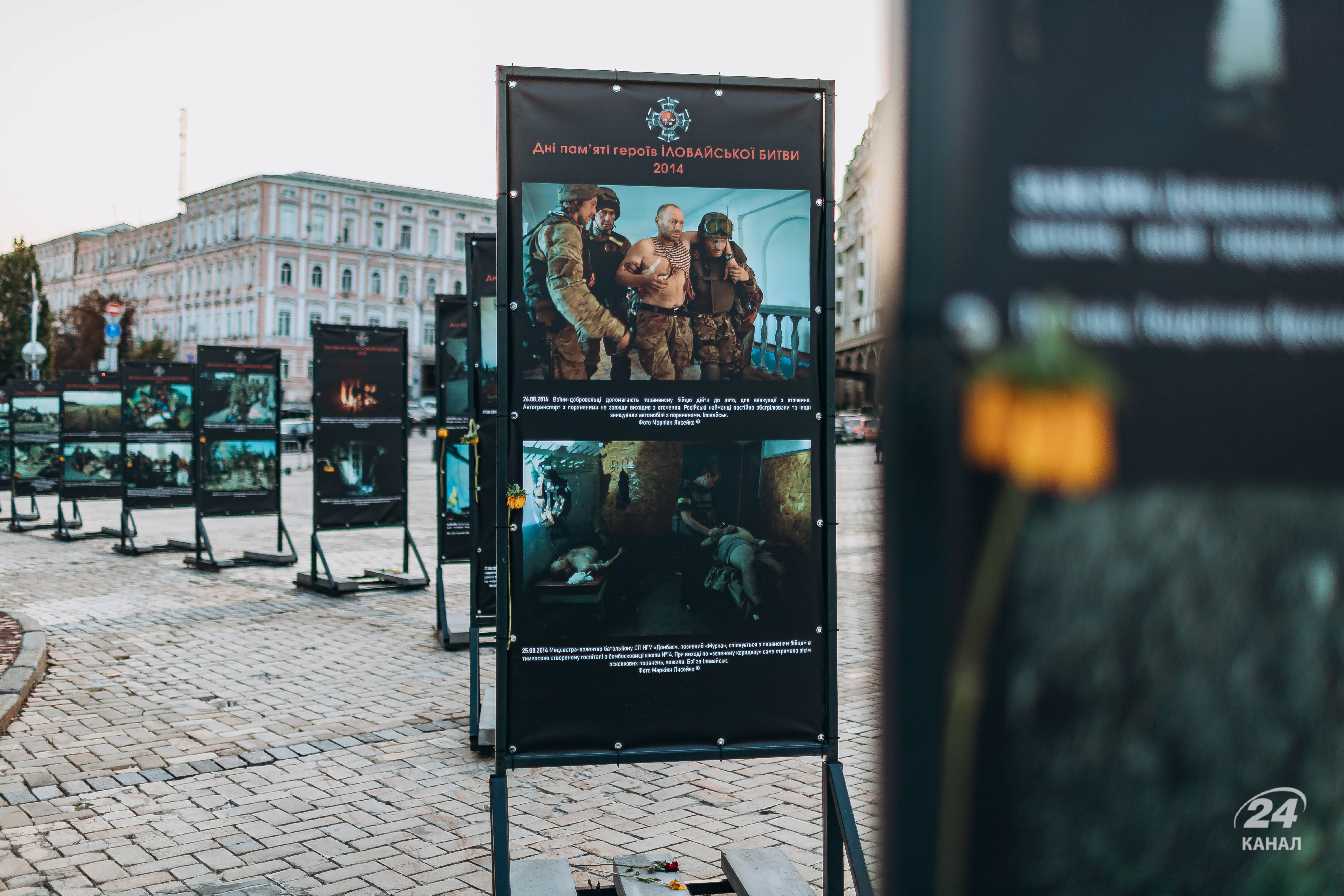 На світлинах видно свічки, що принесли люди до стенда зі загиблими українськими героями. Також неподалік було встановлено ряд плакатів, що розповідають історію оборони Іловайська.