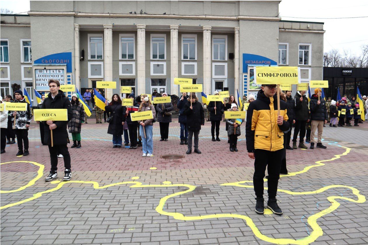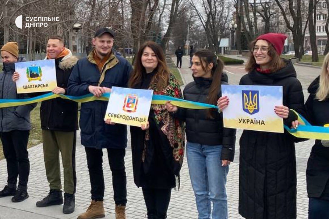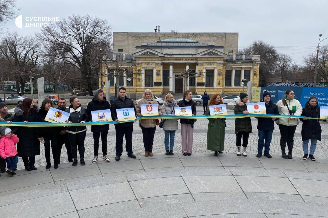 Також у Дніпрі, біля флагштока з прапором України, організували "ланцюг єдності". В акції взяли участь близько сотні людей. Вони тримали в руках таблички з назвами українських міст, зокрема деокупованих та тих, що зараз в окупації.