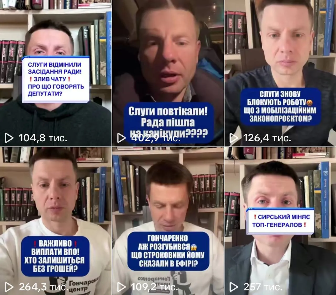 Також депутат публікує відео з заголовками, у яких говорить про себе від 3 особи — "Гончаренко лютує", "Гончаренко оскаженів", "у Гончаренка немає слів" тощо. Усі ці емоційні та клікбейтні надписи нардепа спонукають користувачів подивитися його відео. Зазвичай такі відео на сторінці Гончаренка набирають більше переглядів, однак подібні заголовки можуть посіяти ворожі настрої серед українців та викликати недовіру до держави.