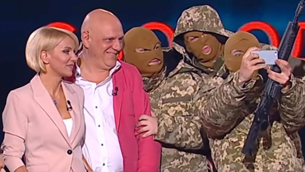 Після цього люди в камуфляжі підійшли до обох ведучих, зробили із ними селфі та втекли зі студії.