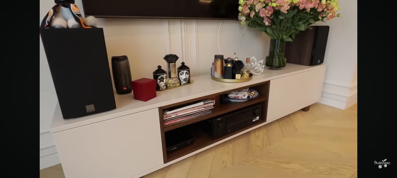 По боках від телевізора – симетрично розміщені колонки, які разом із декоративними елементами створюють візуально збалансовану композицію. Ваза з об'ємним букетом троянд вносить у простір живу емоцію та відчуття доглянутості. Стіну прикрашають ненав'язливі декоративні молдинги, які додають глибини та структури, при цьому не порушуючи загальної стриманої палітри.