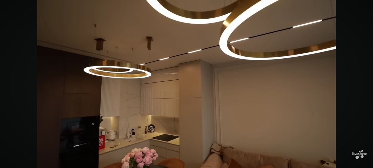 Увагу привертає освітлення: кілька підвісних світильників у формі кругів із м'яким теплим світлом є футуристичними на вигляд й додають об'єму стелі. Лінійні вбудовані лампи завершують образ і підкреслюють геометрію простору.