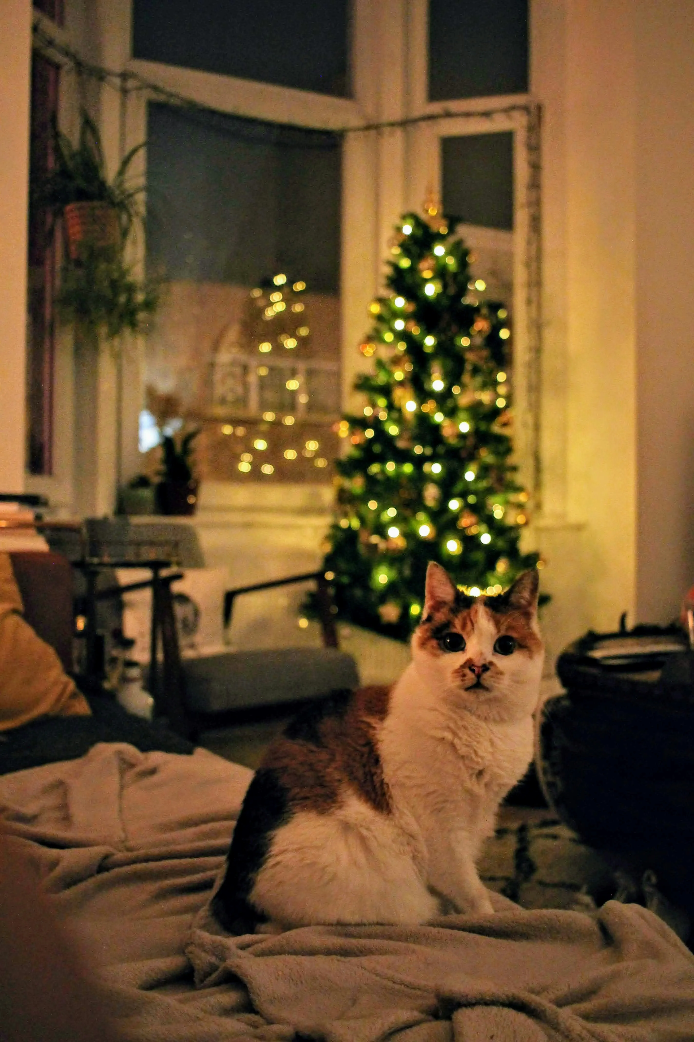 ● Природний фон: розташування дерева навпроти вікна створює тло вічнозеленого листя на фоні зовнішнього ландшафту, додаючи глибини святковому декору.