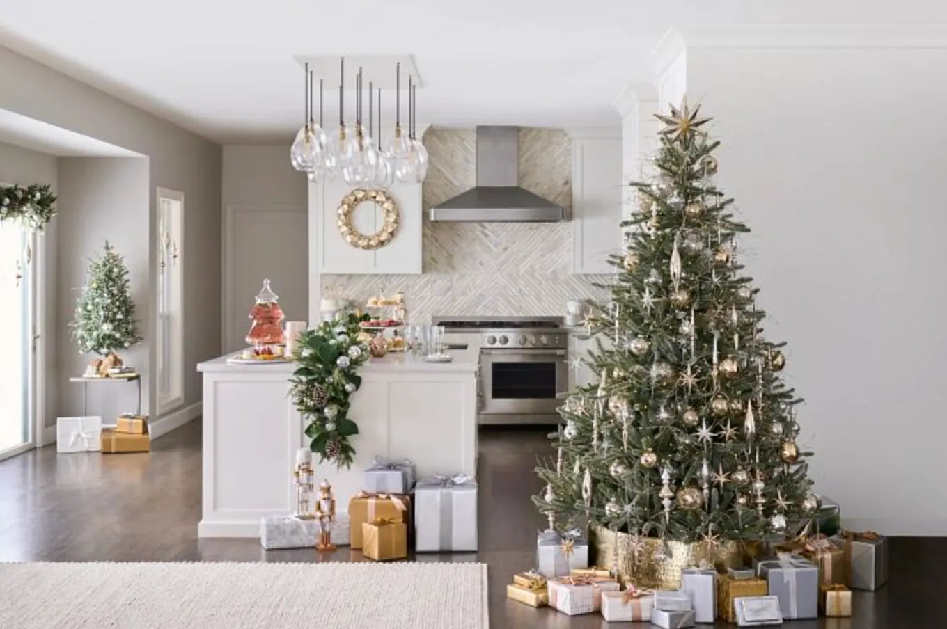Кухня, в яку можна зайти з вітальні – є варіантом, де можна поставити ялинку / Фото (Sanibel Spruce /Modern Metallics Ornament Set)