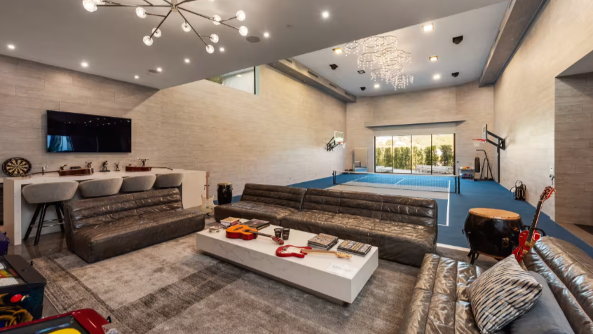 Також маєток має спортивний комплекс з баскетбольними і піклбольними майданчиками, тренажерним залом, боксерським рингом, лаунжем для перегляду спорту і баром. У будинку є і безкрайній басейн.