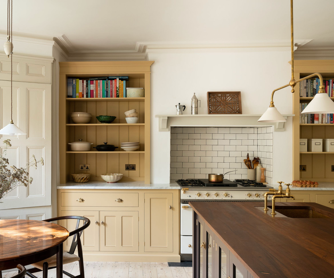 Додайте модний колір до нейтральної кухні. Ця кухня, що на фото, є прикладом вдалого поєднання трьох кольорів. Білі стіни та дерев'яний острів забезпечують класичну та позачасову естетику, а шафи та полиці, пофарбовані у масляно-жовтий колір, вносять яскравий акцент, який покращує загальний дизайн.