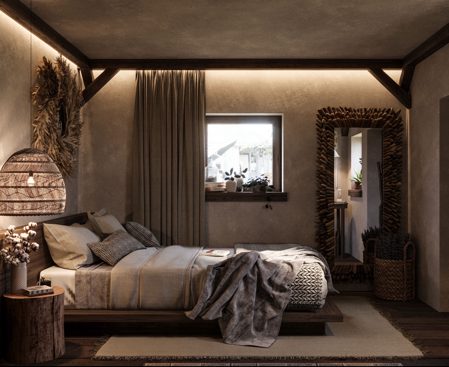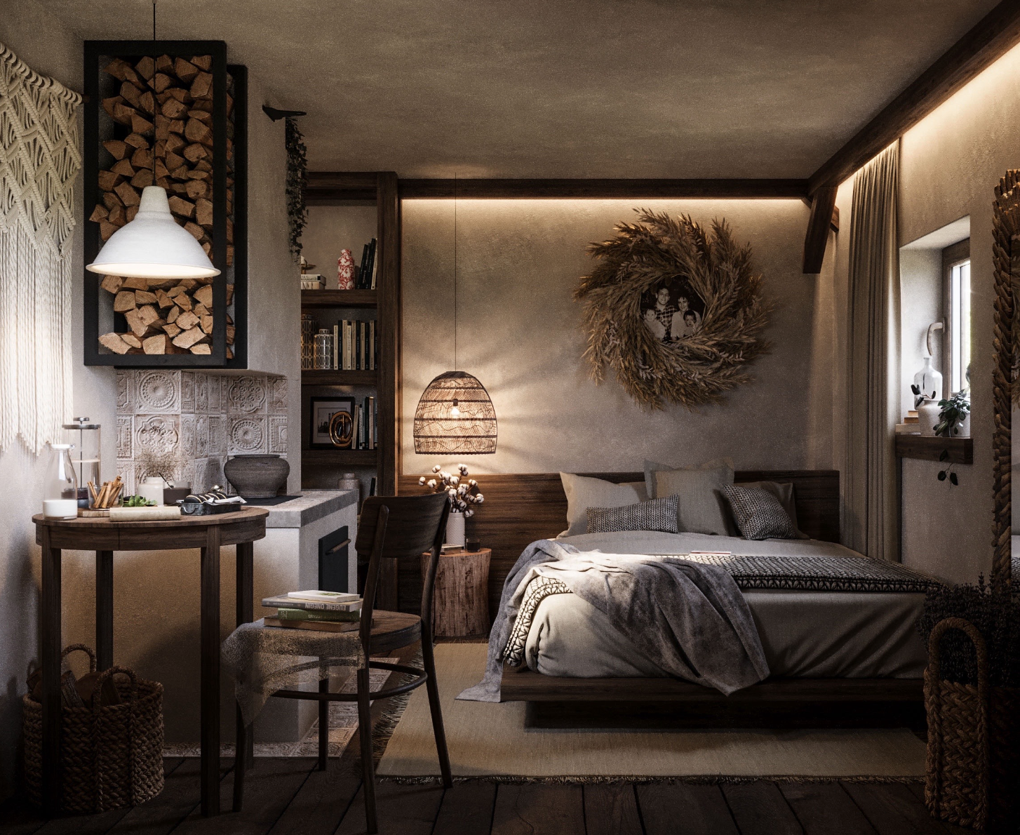 Інтер'єр кімнати виконаний у теплих бежевих та коричневих кольорах, що є традиційними для українського інтер'єру. Акцентами є вироби з дерева – крісло, стіл, основа ліжка і навіть тумба у формі пенька. Та найбільше вражає фото сім'ї у рамці з сухої трави.
