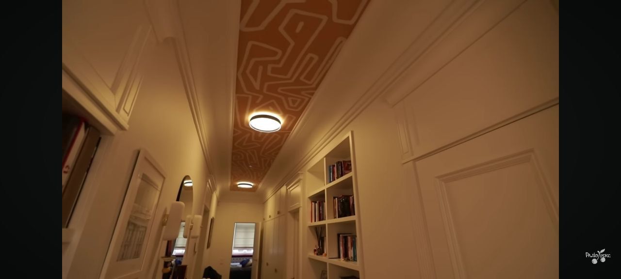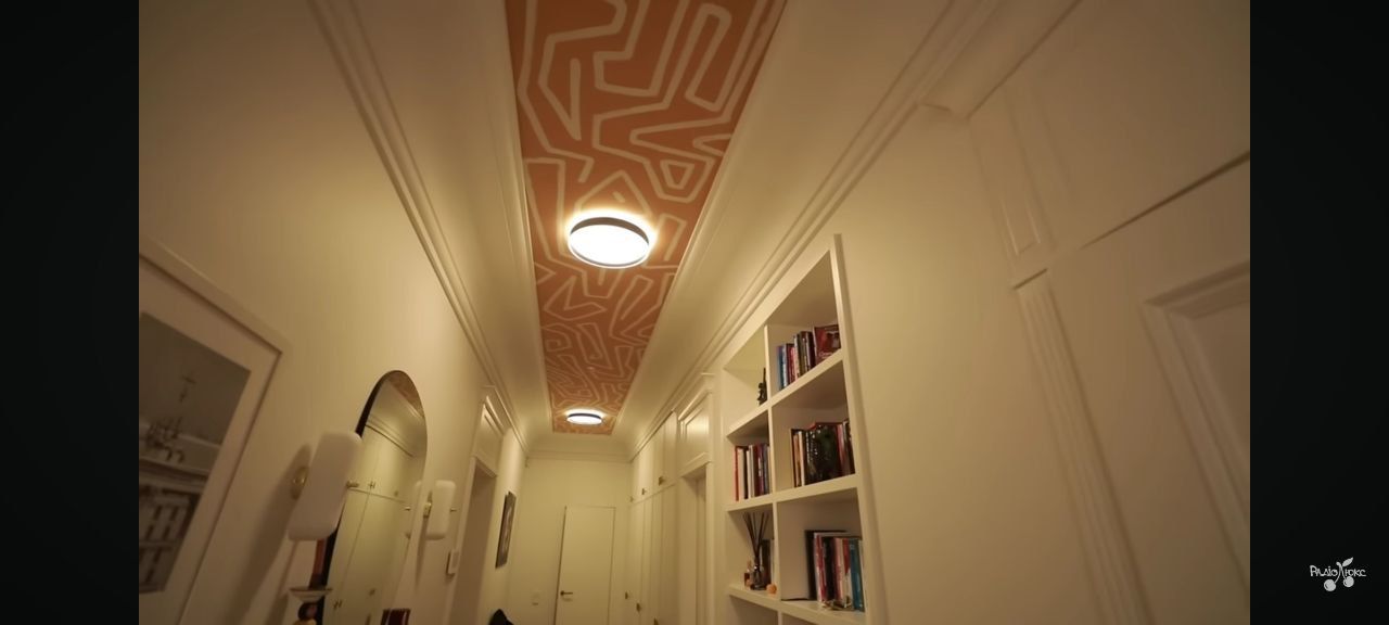Декор стелі має свою історію. Під час роботи над одним дизайнерським проєктом Павелецькій сподобалися стельові шпалери, які створює відома нью-йоркська мисткиня. Втім, вони коштували дуже дорого. Тоді Павелецька попросила українську художницю намалювати цей принт зі шпалер у себе на стелі.