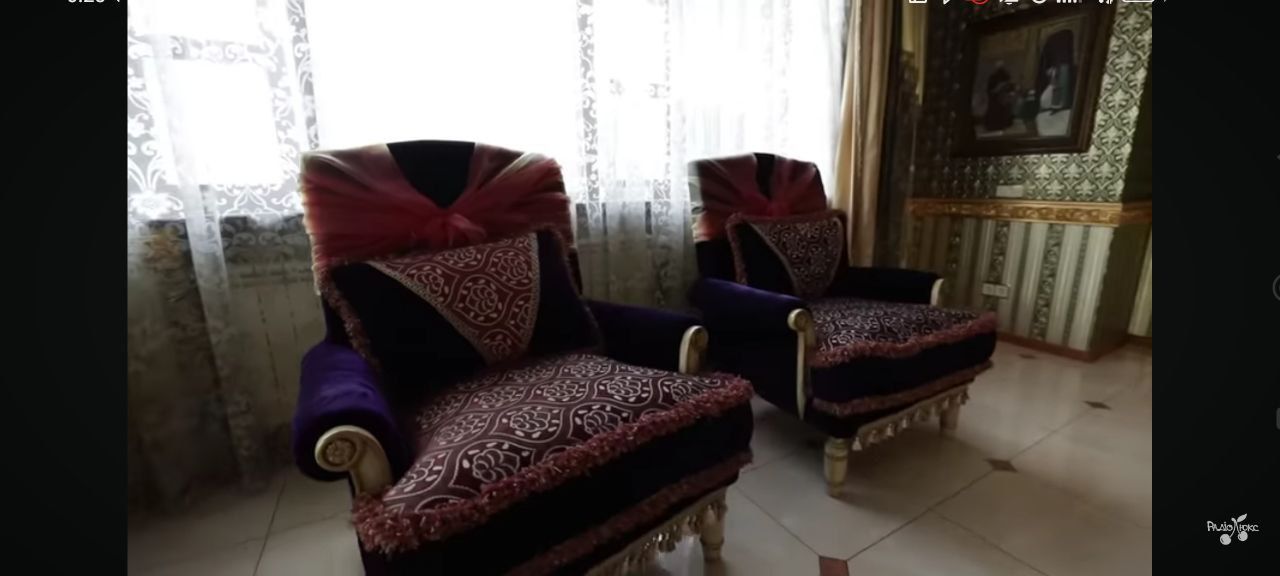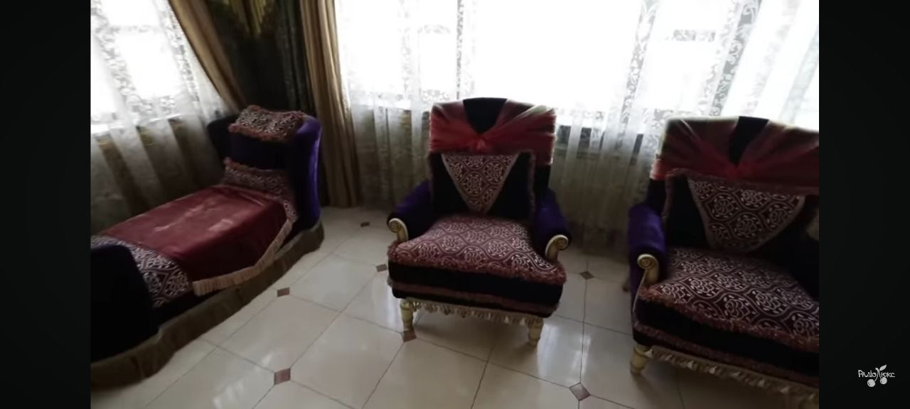 Простір буквально просякнутий декоративністю й демонстративним багатством. Центральним елементом є масивні, м'які крісла та отоманка, оббиті глибоким фіолетовим оксамитом із бордовими й золотими орнаментами, що нагадують східні килими. Спинки крісел прикрашені декоративними бантами з блискучої тканини, що надає приміщенню майже театрального ефекту, як у тронному залі або салоні для знаті.