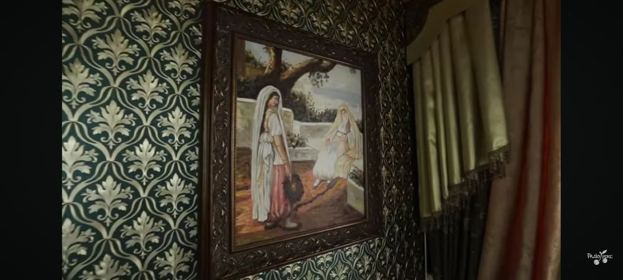 Стіни вкриті шпалерами з важким, рельєфним візерунком у золотисто-чорних тонах. Візерунок повторюється і на карнизах, і на дерев'яних оздобленнях. Декоративні колони пофарбовані у яскраво-золотий колір, вони візуально відокремлюють зони приміщення та підтримують загальну помпезну атмосферу. Легкі фіранки, прикрашені підвісками з намистин, створюють ефект приватності та гри світла, додаючи повітряності цій пишності.