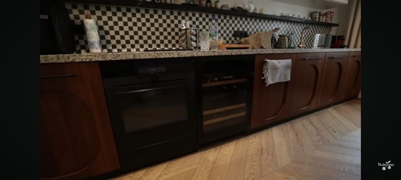 Нижні шафи виготовлені з темного дерева. Вони мають оригінальний 3D-рельєф. Далі видно чорну вбудовану духову шафу та винний холодильник. Чорна техніка гармонійно поєднується з темними фасадами і робить кухню візуально стриманою і сучасною. Красивий паркет "ялинкою" світлого відтінку додає тепла і затишку, врівноважує темні меблі і чорні елементи техніки.