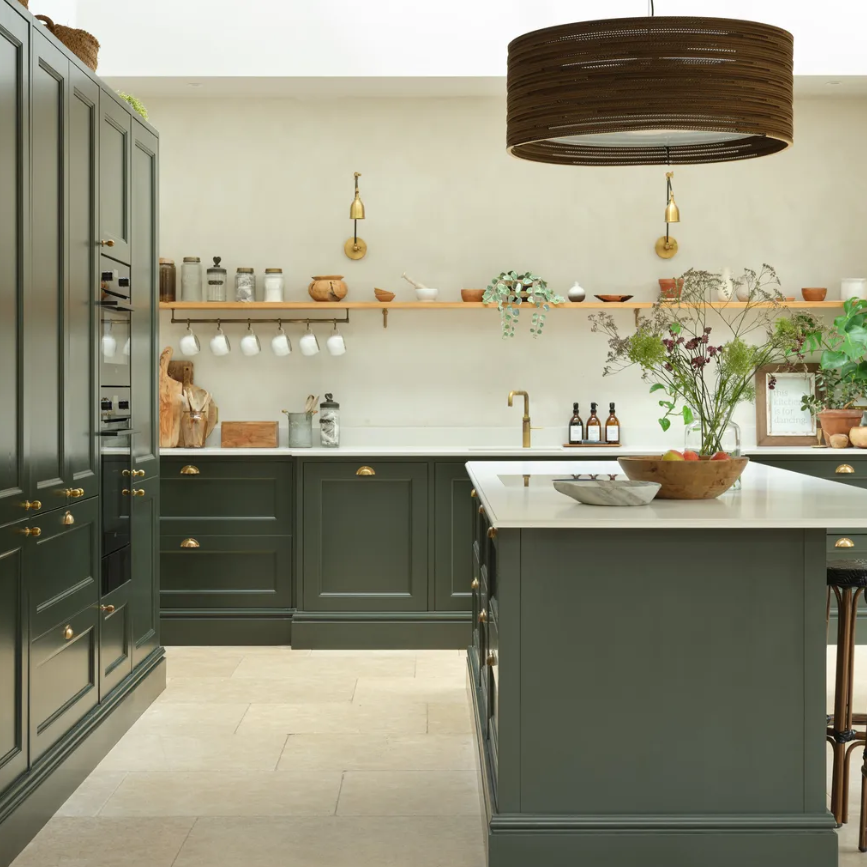 Якщо вам складно повністю відмовитися від білого й перейти до темних чи яскравих кольорів, тоді тональне оформлення – чудовий компроміс. Обирайте теплі відтінки – від кремово-нейтральних і м'яких пастельних до оливково-зелених. Такі кольори створюють затишну, домашню атмосферу й добре працюють як на шафках, так і на стінах.