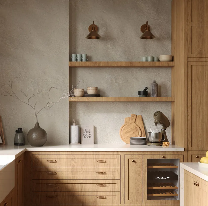 Можливості для декору кухонних стін майже безмежні. Кухонні шпалери додадуть простору шарму. Альтернативно, можна вибрати фарбу з цікавішим ефектом, наприклад, вапняним покриттям. Воно додає текстури навіть у простий нейтральний дизайн і не перевантажує простір.