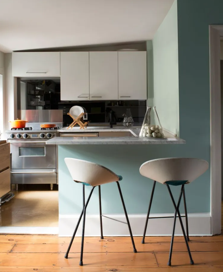 - Зелений і блакитний кольори підходять для зайнятих кулінарів, оскільки вони заспокоюють і візуально збільшують простір.