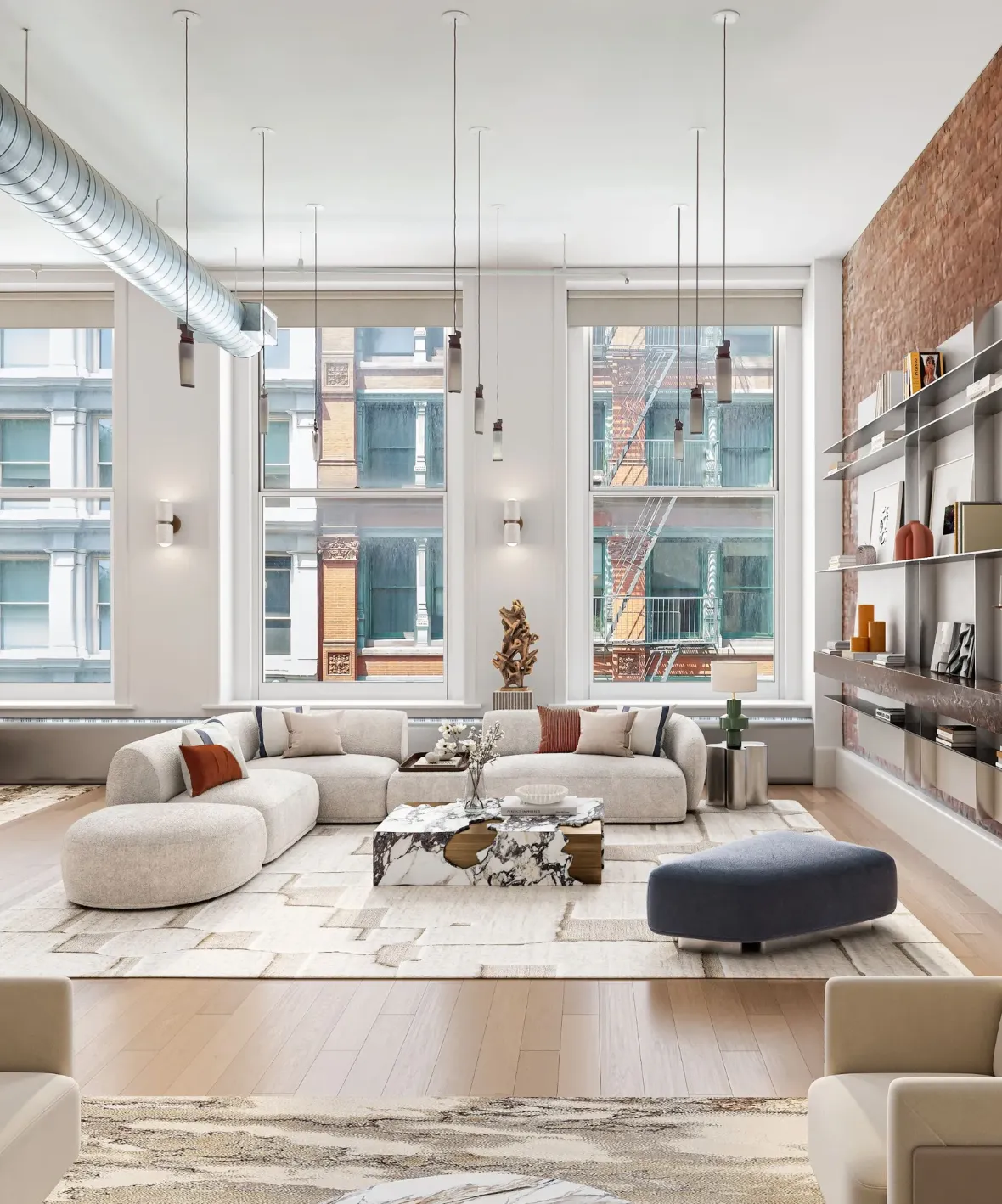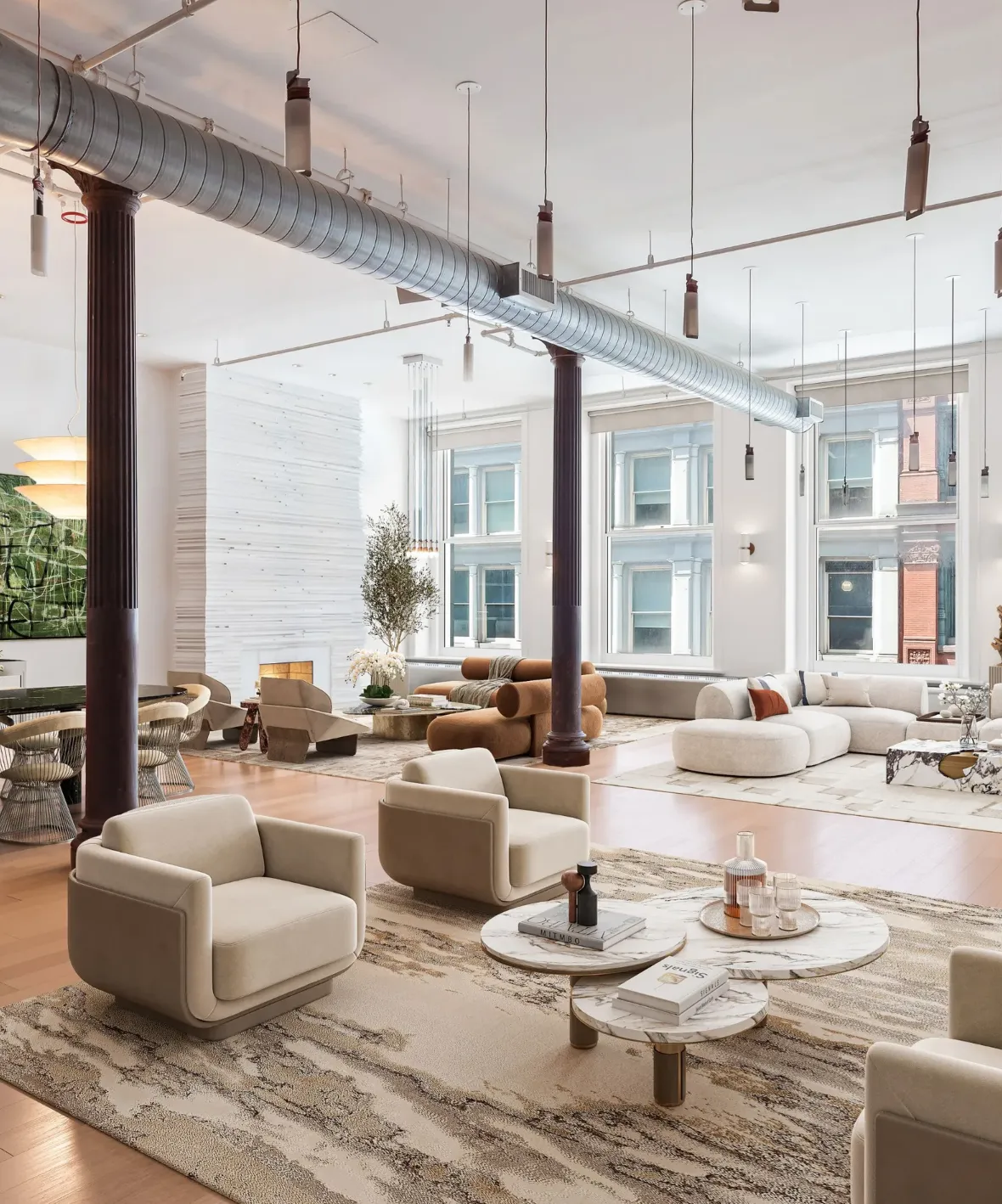 Лофт має 13-футову стелю, оригінальні коринфські колони та десятифутові вікна, що виходять на захід, які наповнюють житловий простір відкритого плану природним світлом і виходять на історичну архітектуру центру міста.
