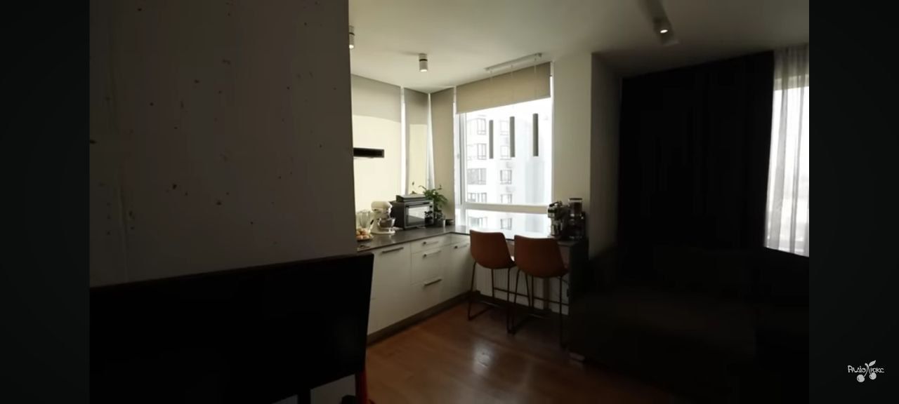 Простора барна зона біля панорамного вікна створює ідеальне місце для сніданків або кавових пауз із краєвидом на місто. Два стильні барні стільці теплого коричневого відтінку додають затишку. Вертикальні підвісні світильники над барною стільницею – лаконічні та сучасні.