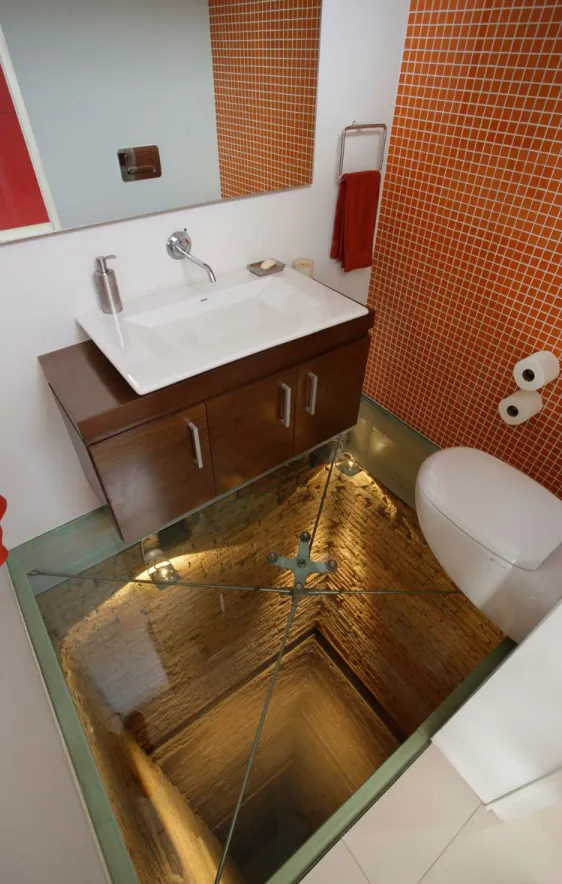Гвадалахарська студія Hernandez Silva Arquitectos розробила інтер’єр пентхауса, що розташований на вершині мексиканської колоніальної будівлі 70-х років у Гвадалахарі, Халіско, Мексика. Його ванна кімната зі скляною підлогою, розташована над шахтою ліфта, що не використовується, на висоті 15 поверхів. Вона стала справжньою інтернет-сенсацією. Такий інтерʼєр змушує затамувати подих.