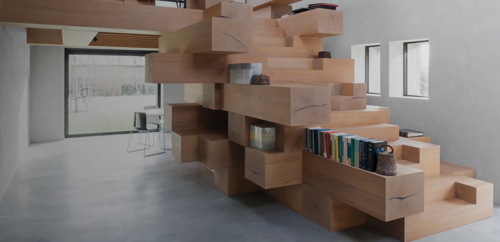 Кілька унікальних конструкцій дозволяють максимально використати тісний простір під сходами. Так, в самих сходах є місце, де можна сховати книги. Кожен рівень може приховати кілька книг.