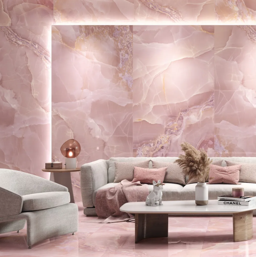 - Плитка з ефектом оніксу доступна в широкій палітрі кольорів, розмірів і візерунків, тож легко адаптується до різних стилів інтер'єру.