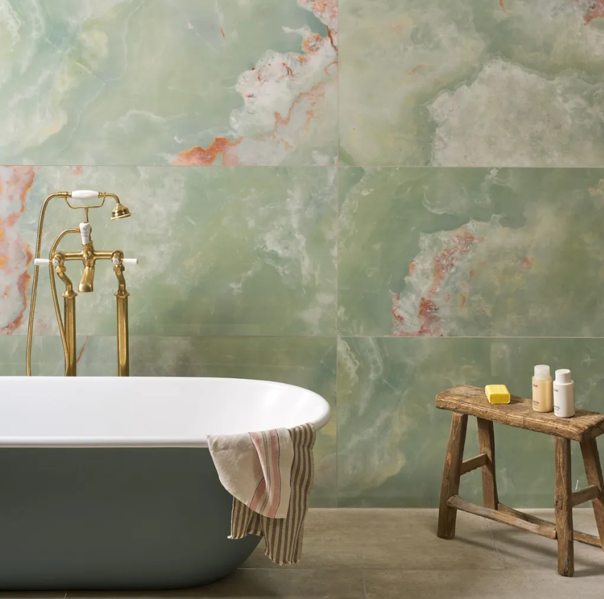 - на відміну від природного оніксу, який є більш делікатним, порцелянова плитка дозволяє досягти того ж ефектного вигляду у ванних кімнатах, кухнях чи навіть у коридорах, при цьому вона міцна і легка у догляді;