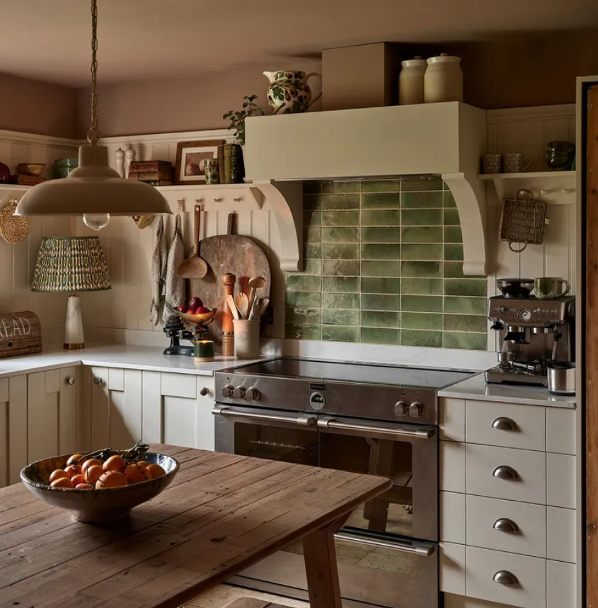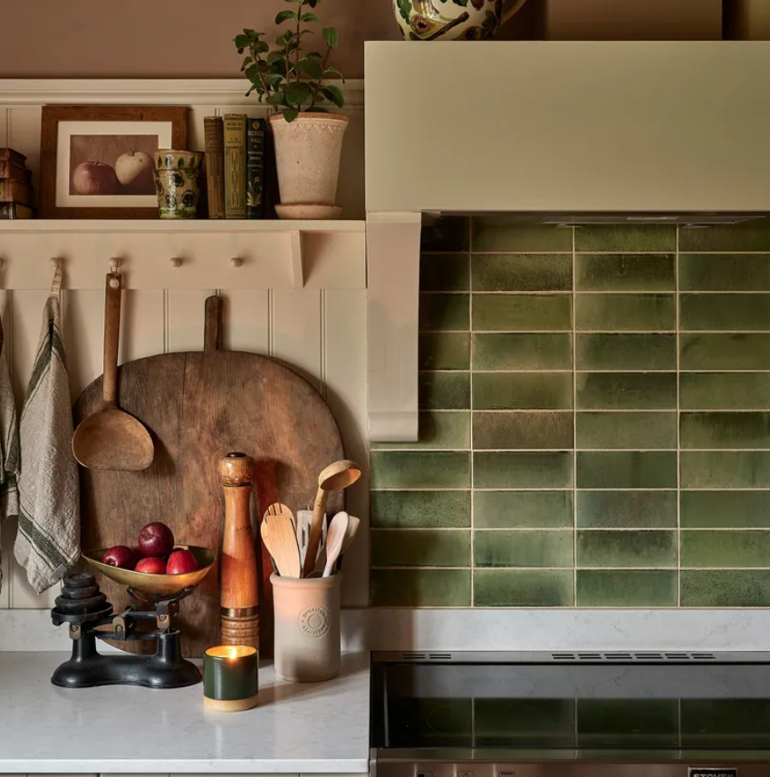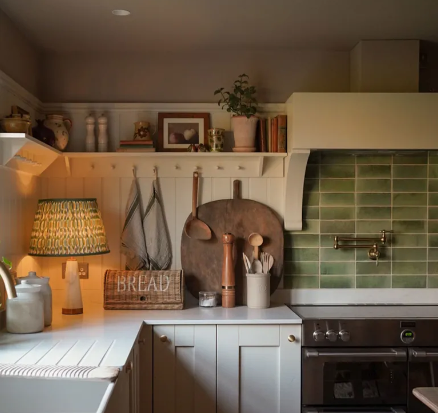 Останнім штрихом став кухонний фартух, виконаний із зелених порцелянових плиток. Яскравий колір чудово поєднується з нейтральними відтінками в кухні і створює фокусну точку, яка одразу привертає увагу до плити та зони поруч, де Джесс обожнює показувати свої улюблені кухонні аксесуари.