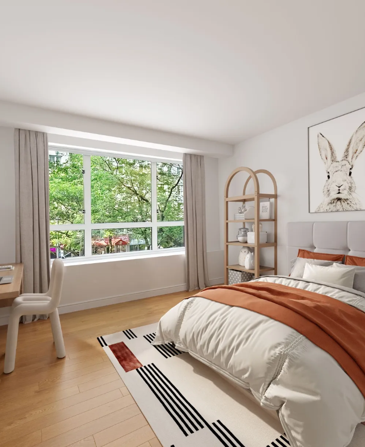 Между тем третья спальня имеет некоторые современные акценты, такие как круглое кресло за рабочим столом и ковер с эффектом полос. Популярный оранжевый цвет добавляет яркости в общий нейтральный интерьер.