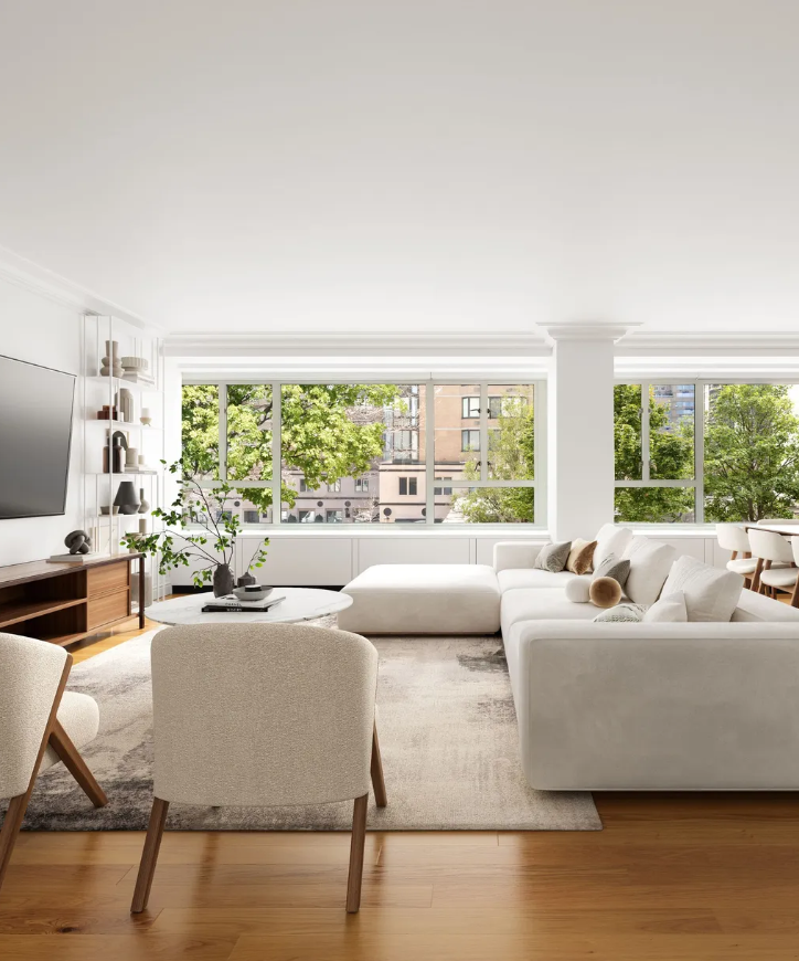 Гостиная, в свою очередь, теплая и гостеприимная, с нейтральными цветами, от деревянных полов до кремовых диванов и обивочных акцентных кресел. Деревянный медиаконсоль и плавающие полки добавляют визуального интереса к стене, а большие окна открывают прекрасный вид на город.