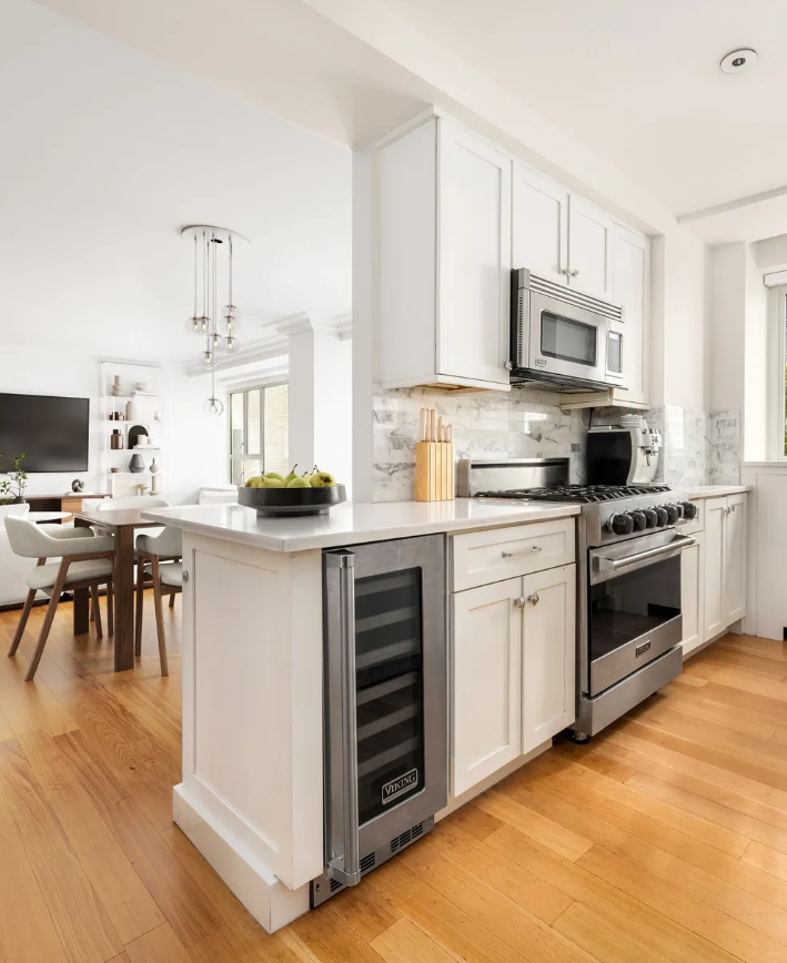 Кухня свежая и воздушная благодаря белым столешницам, деревянным полам и современным бытовым приборам. Места для шкафов вполне достаточно. Пространство открытого типа плавно переходит в гостиную, с белой и деревянной палитрой, присутствующей во всем интерьере.
