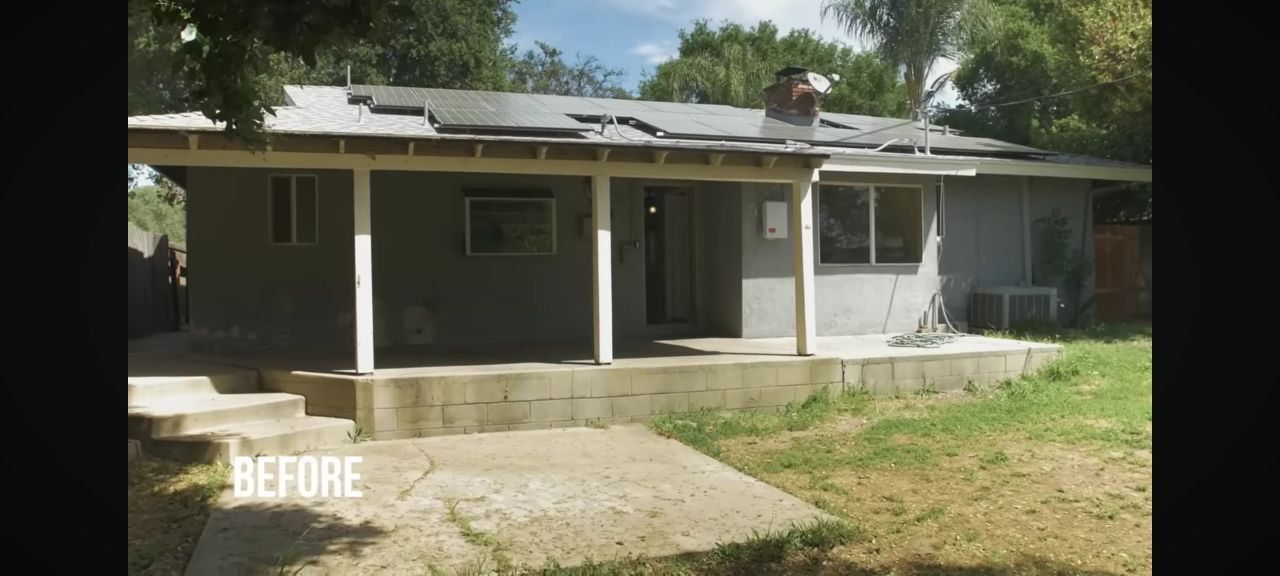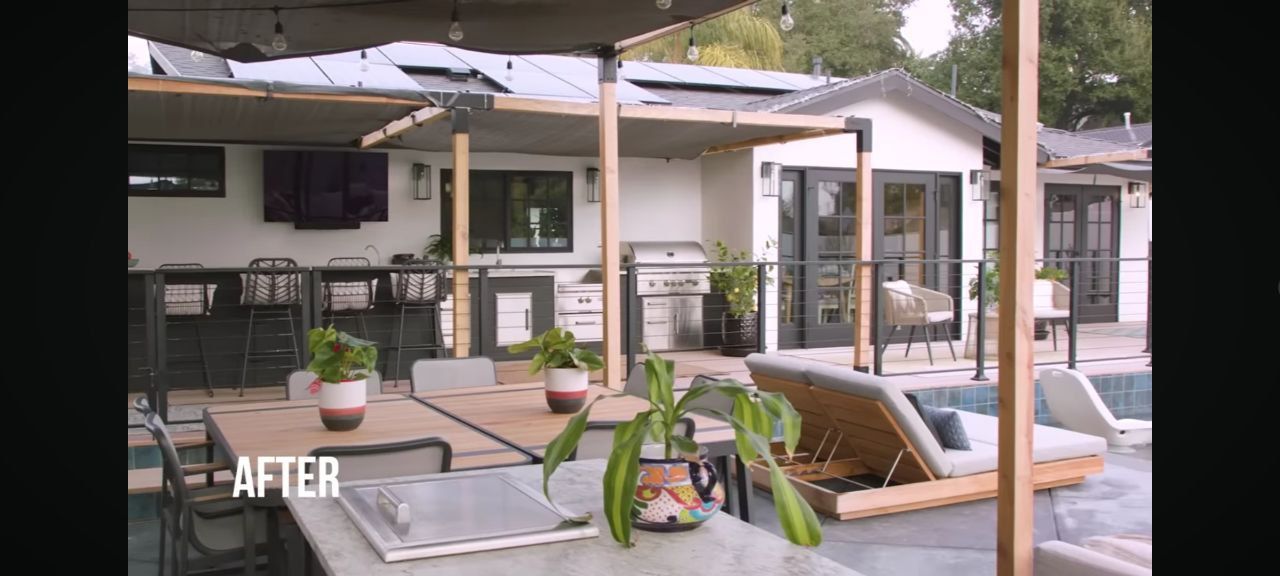 В публикации есть изображения заднего двора до реконструкции, на которых видно патио со стеклянным обеденным столом и деревянным забором. Другой кадр показывает гриль и небольшой приставной столик на патио.