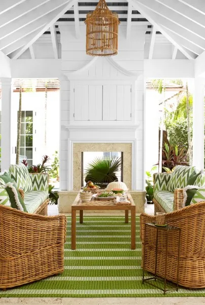 Эта уличная гостиная, созданная Амандой Линдрот, является идеальным местом для развлечений и отдыха. Присмотритесь к шкафу в форме пагоды над камином, и вы заметите, что он открывается, разоблачая скрытый телевизор.