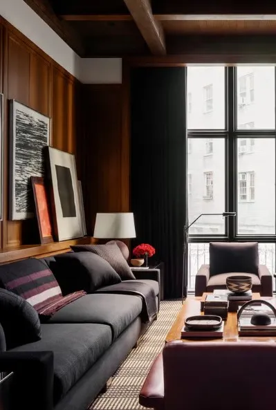 Эта формальная гостиная, спроектирована Марком Каннингемом, также служит комнатой для отдыха. Чтобы убедиться, что она подходит для обоих сценариев, Каннингем встроил скрытый телевизор в полку задней стены, который выдвигается, когда жильцы хотят отдохнуть за просмотром фильма.